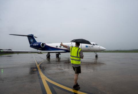 The NSF/NCAR G-V (N677F) arrives at Osan AB as part of the ACCLIP campaign.