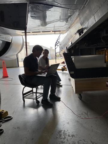Andrew Rollins (LIF SO2 and NO) gets some help from Georgia Michailoudi (SP2) during a power check for the LIF instrument during integration at JSC.