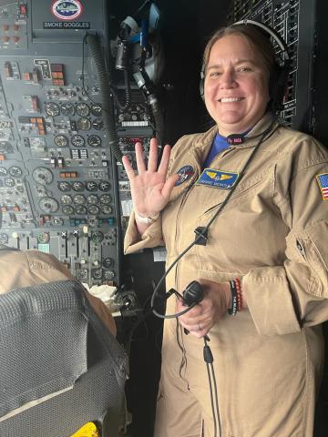 Carrie Worth (AFRC) in the cockpit of the DC-8 for Science Flight #4.