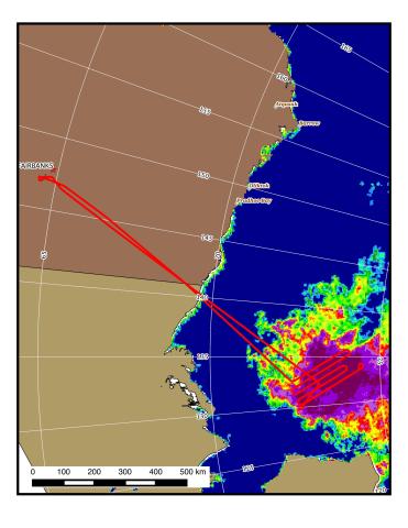 Sea-ice concentration analysis from AMSR on September 10 and the C-130 flight track on September 11, 2014 (courtesy of Matt Beckley, SGT/NASA GSFC).