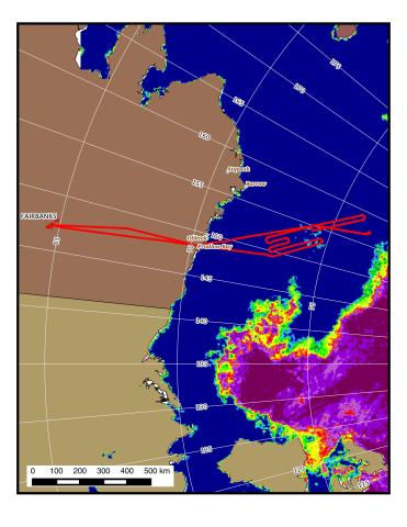 Sea-ice concentration analysis from AMSR on September 14 and the C-130 flight track on September 15, 2014 (courtesy of Matt Beckley, SGT/NASA GSFC).
