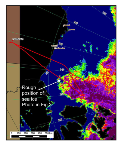 Sea-ice concentration analysis from AMSR on September 5 and the C-130 flight track on September 6, 2014.