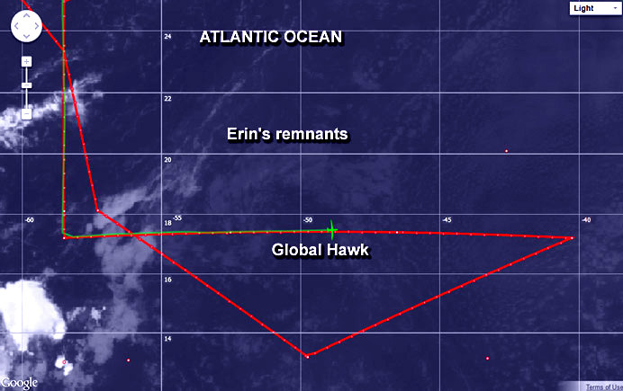 One of two of NASA's Global Hawk unmanned aircraft flew over the remnants of Tropical Storm Erin and investigated the Saharan Air Layer in the Eastern Atlantic Ocean on Aug. 20 and 21.