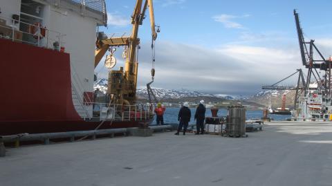 Healy crew craning equipment onto the ship