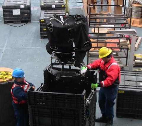 Healy crew uncrating instruments from Scripps Institute of Oceanography