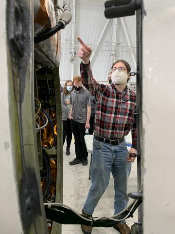 Chip Helms, IMPACTS Co-investigator (NASA GSFC/USRA) gave a detailed tour to a group of local students on 2/12/2022. Chip is seen here pointing out an instrument on the ER-2 aircraft as the students look on.