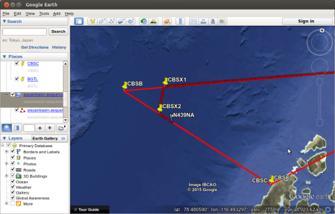 A screenshot showing our "cut the corner" maneuver, forced upon us by the shortened Friday airport hours at Thule. The lighter red line is the planned route, and the darker red line is the actual path.