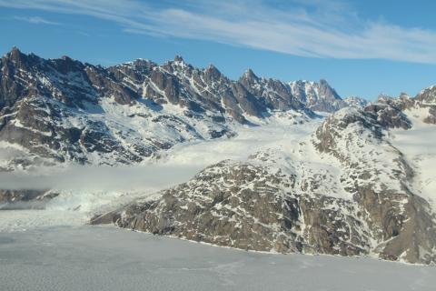 A small glacier emptying into the fjord of Kangerdlugssuaq Glacier, from its north wall. Note the isolated stratus cloud near the glacier's face.