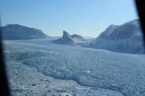 The lower portion of the Kangerdlugssup Glacier, with its characteristic half-dome shaped mountain adjoining its southern flank.