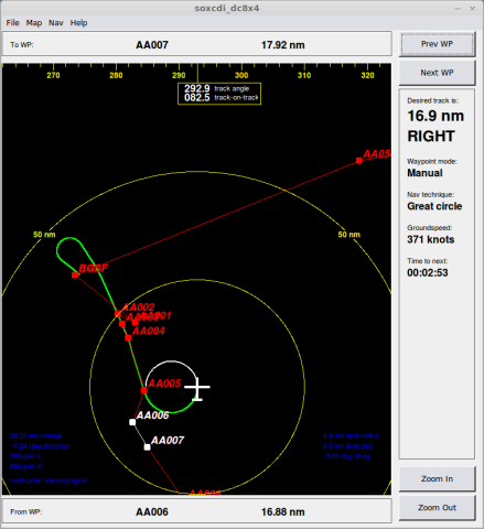A screenshot of our "SoxCDI" precise aircraft navigation system display during our overflight of the "K-Transect" sites today. The inconvenient kink in the line of sites between waypoints AA005 and AA006 required us to execute a 360 deg turn at that point, at 400 knots and in controlled airspace frequented by trans-Atlantic airliners. We successfully overflew every one of the K-Transect sites today. This required not only excellent airmanship on the part of our pilots, but also careful coordination with air traffic controllers, over noisy, static-prone radio links, to ensure safety. This sort of professional teamwork in the safe pursuit of science goals is the bread-and-butter of NASA's research pilots.