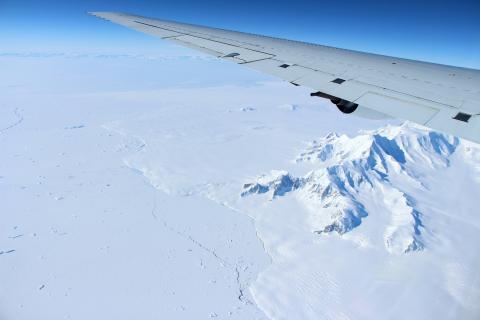 The mountains of northern Alexander Island passing under the left wing of the DC-8.