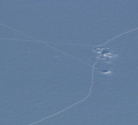 Fresh sets of polar bear tracks on the sea ice in front of the southern terminus of Humboldt Glacier. We see many sets of bear tracks in this particular location every time we fly over this area.