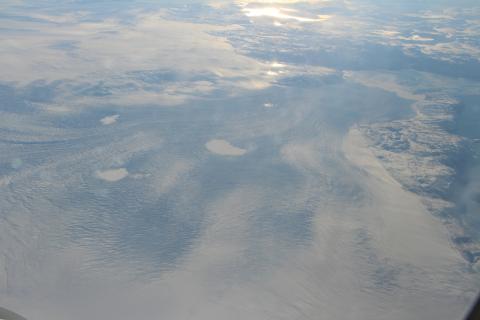 Store Glacier, viewed from 29,000' MSL and several km to the north. Store Glacier lies approximately 150 km north of Jakobshavn Glacier. The photograph is somewhat obscured by scratches on the aircraft window through which it was shot - a common problem.