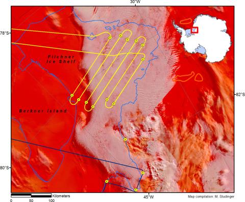 Trajectory plotted over the MODIS false color image using bands 3, 6, and 7 for the red, green and blue components of the digital image. Thick ice and snow appears vivid red (or red-orange), while small ice crystals in high-level clouds are reddish-orange or peach.The image includes scenes aquired between 01:00 and 04:00 UTC or roughly 15 hours before we reached the survey area and was available fordownloaded shortly before takeoff.