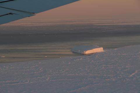 Small iceberg, situated at the edge of a large lead, in the north-central Weddell Sea, prettily illuminated by the setting sun.