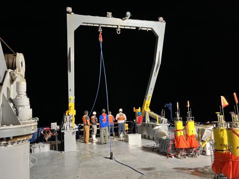 Members of the science team onboard the R/V Bold Horizon receive a training session on the EcoCTD instrument.  The EcoCTD instrument is capable of concurrently measuring both hydrographic and bio-optical properties such as oxygen, chlorophyll fluorescence, and optical backscatter while the ship is underway.
