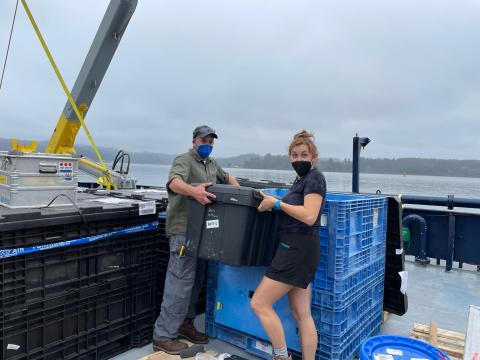Pat Kelly and Sarah Lang from URI are seen uploading their instrument cargo during the R/V Bold Horizon mobilization at Newport, Oregon.