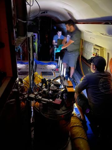 Clayton Elder checks on AVIRIS instrument while Amin Nehrir and Taylor Shingler inspect HALO on board the LaRC GIII - N520NA